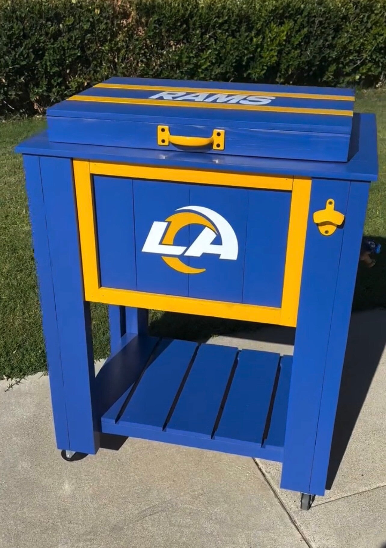 This custom-made Los Angeles Rams ice chest cooler is perfect for true Rams fans who love to entertain in style. Built with a sturdy wooden stand and finished in the iconic royal blue and gold colors, it features a premium Igloo cooler insert, bottle opener on the front, working drain spout, and rolling caster wheels for easy movement. The front panel is finished with the bold LA Rams logo, giving it a premium game-day look that stands out at tailgates, backyard parties, barbecues, patios, and man-caves.